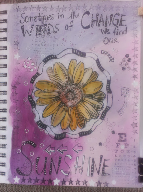 Lots of paint, and a fabulous daisy stamp from Stampendous in the middle. Plus I got to try out some of my "fancy" writing!